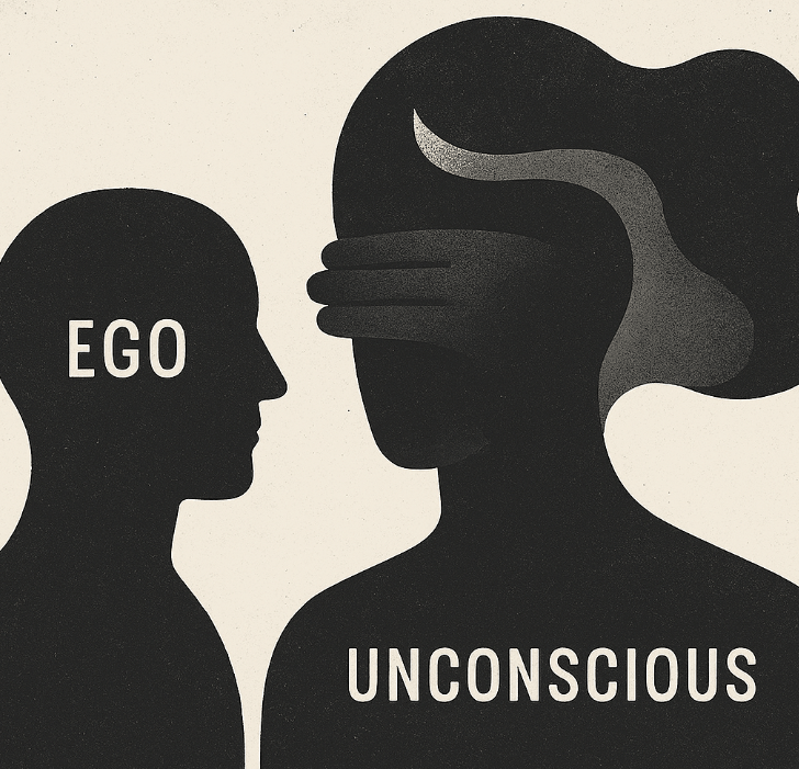 This is a subdued illustration predominantly in grayscale tones. The upper portion features the profile of a young man with his eyes closed, appearing to be in a calm, meditative state, seemingly symbolizing the conscious ‘ego’. Below his shoulders, a dark, shadowy area begins, within which the faint face of the other man looks directly forward. This image of the girl can be interpreted as a visual representation of the ‘unconscious’ mind, hidden beneath the man’s consciousness and sometimes difficult to perceive. Overall, it conveys a profound meaning, hinting at the relationship between the conscious self and the unconscious residing within, or the way repressed emotions manifest.