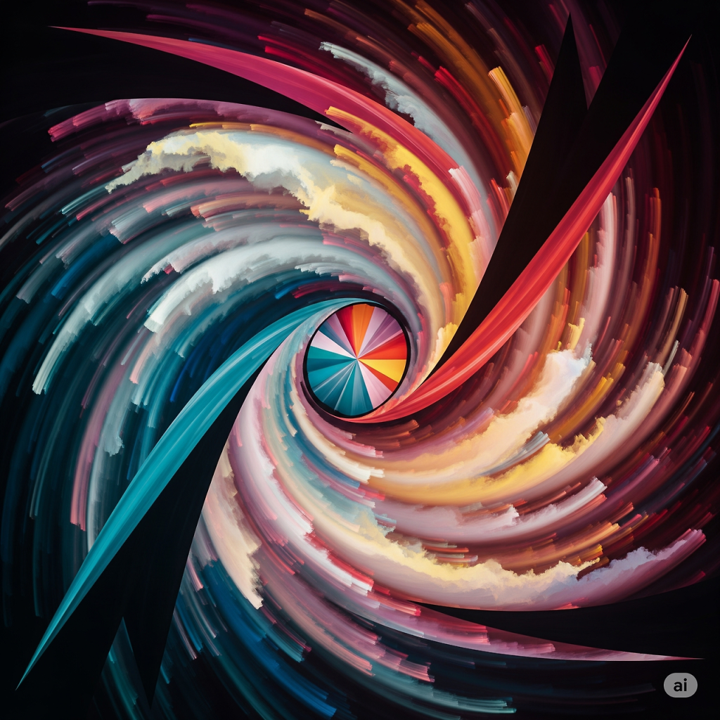 This is an abstract image featuring a vibrant swirl of colors against a dark background. Starting from a small central circle, diverse hues, predominantly reds, yellows, blues, pinks, and mints, violently extend outwards, forming a dynamic spiral pattern. Cool blue tones intertwine with warm red and yellow shades, creating a strong contrast that visually suggests complex inner emotions or the turbulent conflict between the ego and the unconscious.